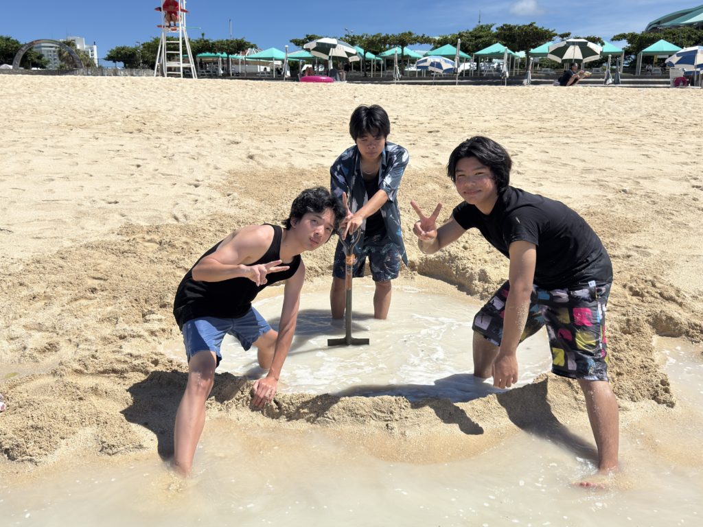 砂浜に、大きな穴を掘っていた、男子チーム!