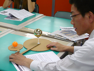 まずは教室で『日食って何?』という解説講座からはじまり、少しずつ日食に対する知識を深めていきました。解説にはK先生オリジナル「日食模型」も登場し、みんな今までなかなか理解できなかった日食のメカニズムがわかったようです(^◇^)