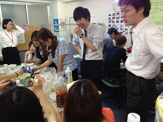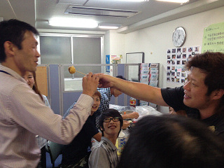 事務局から様子を見に来た立川先生も、駆けつけでTくんからいきなり衝撃的なたこ焼きのプレゼント贈られて・・・うれしそうでした~(笑)