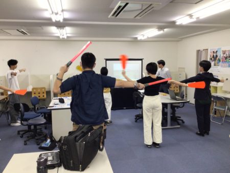 専門の道具「パドル」を使用し、両手両腕を使って「マーシャリング」をして飛行機を誘導する練習をしてみました。生徒たちもお手本の動画を見ながら一生懸命練習をしましたが、パドルも結構重くて、すぐに腕がパンパンになってしまっていました。先生が言うには「グランドハンドリングは1万時間マーシャリングの経験を積んで、初めて一人前になる」とのことで、みんなそんなに大変な仕事なのかととても驚いていました。